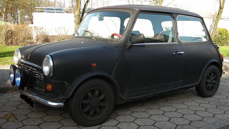 Das Bild zeigt die "kleine schwarze Faltschachtel." Ein 89er MkII Mini Jubiläumsmodell. Bauartbedingt nicht sehr schnell, Stoffschiebedach, Rost an den Blechen, wackelige Elektrik, aber ansonsten in, naja, Topform :)