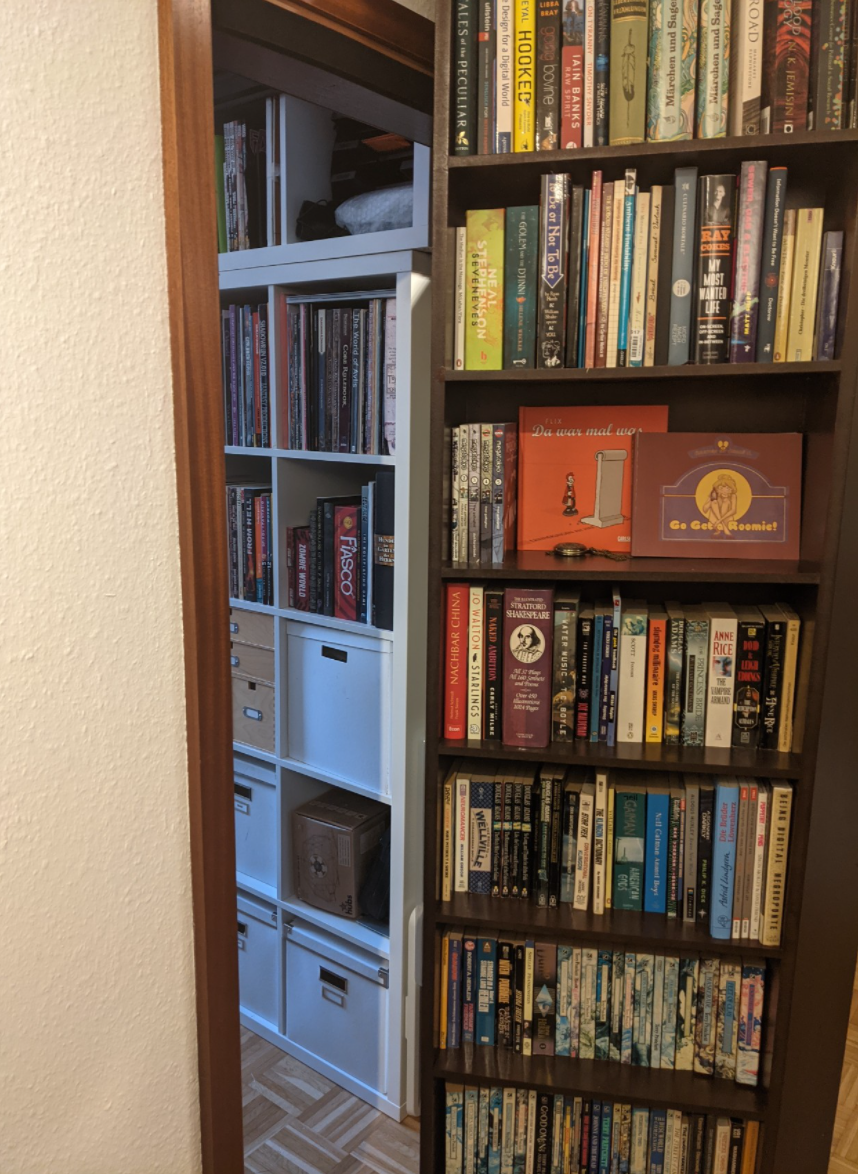 That meant that I had to get rid of the door, as it opened to the inside of the room and would have been blocked by the storage shelf. As a replacement, I fulfilled that inner nerds dream and built a secret door!