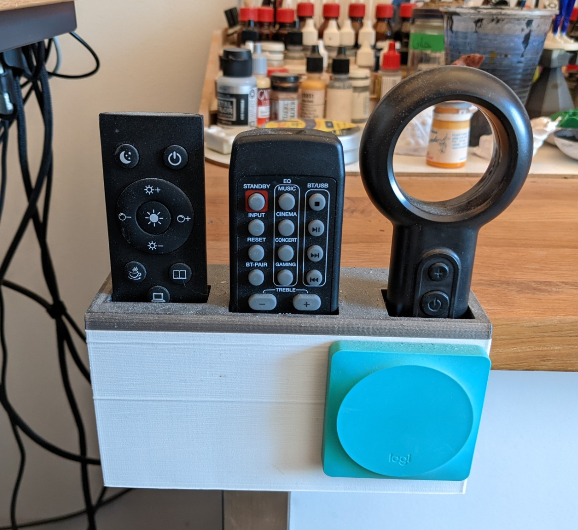 And yes, the motordesk and treadmill are still there, and I also managed to put the remote control holder into a fitting place on the workbench. That green button is a Logitech POP button that I use to switch the treadmill and 3D printer on or off.