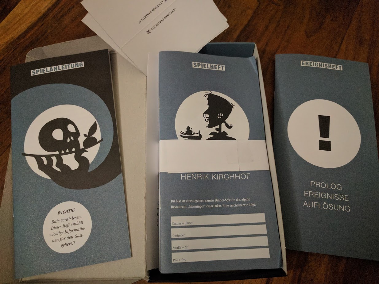Anleitung, kombinierte Rollen- und Einladungsheftchen, Platzkarten und ein Ereignisheftchen. Die Heftchen haben einige Abschnitte, die mittels Perforation gegen unabsichtliches aufblättern geschützt sind. Hier soll man nur zu bestimmten Zeitpunkten weiterblättern. Die Platzkarten sind unbeschriftet, und in anderen Boxen fand ich auch noch Umschläge für den Postversand. Das braucht man alles nicht, und bei einem Preis von 23 Euro auch zu verzeihen, aber dennoch, irgendwie schade.