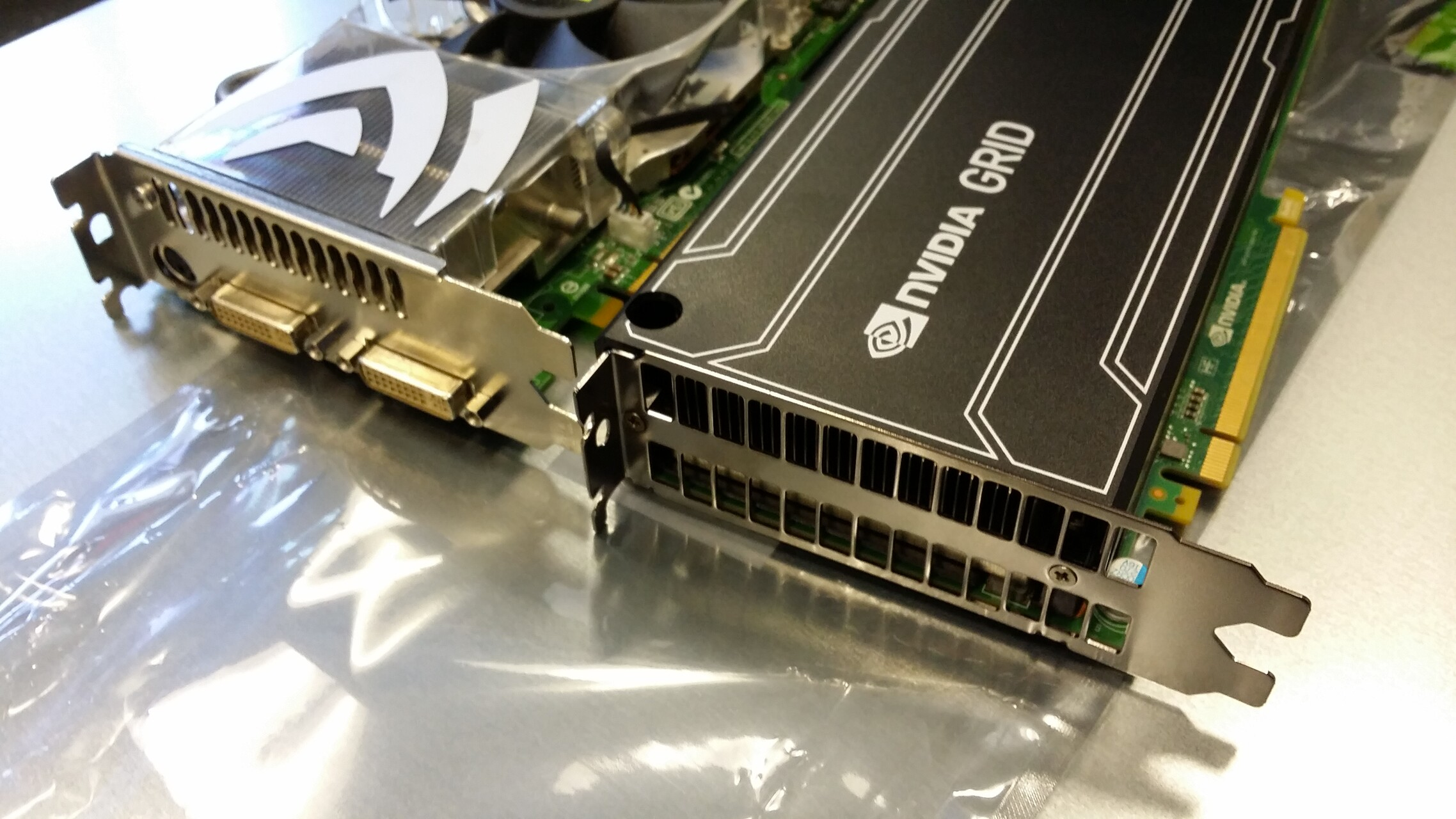 Gebraucht wird das innerhalb eines Maschinenbaubetriebes, der zumindest Teile seiner CAD-Konstruktionsarbeitsplätze virtualisieren will. Dieses beeindruckend große Stück Hardware liefert eine grob äquivalente Grafikleistung wie zwei herkömmlicher Quaddro-Grafikkarten (von denen eine zum Vergleich auf dem Bild zu sehen ist).