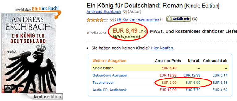 Und schaute dann zuerst mal bei Amazon, was denn so die Kindle-Edition kostet. Hm, 1,50 mehr, als ich für ein so-gut-wie-neues Buch bezahlen müsste, und 1,50 weniger, als ich für das jetzt-wirklich-neue Buch hinlegen soll.