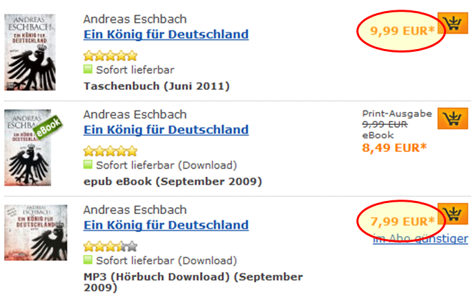 Netterweise zeigt Libri bei der Suche nach dem Titel auch gleich ganz andere Medien, wie zum Beispiel MP3s an. Dieses ist nicht ganz so gut bewertet, wie die anderen Ausgaben, aber eines fällt auf: Das Produkt, das im Vergleich zum "rohen" Buchtext noch einiges an Extraarbeit erzeugt (Nachbearbeitung, Text kürzen, Sprecher, Regisseur, etc.) kostet am wenigsten! Nochmal 1,50 billiger!
